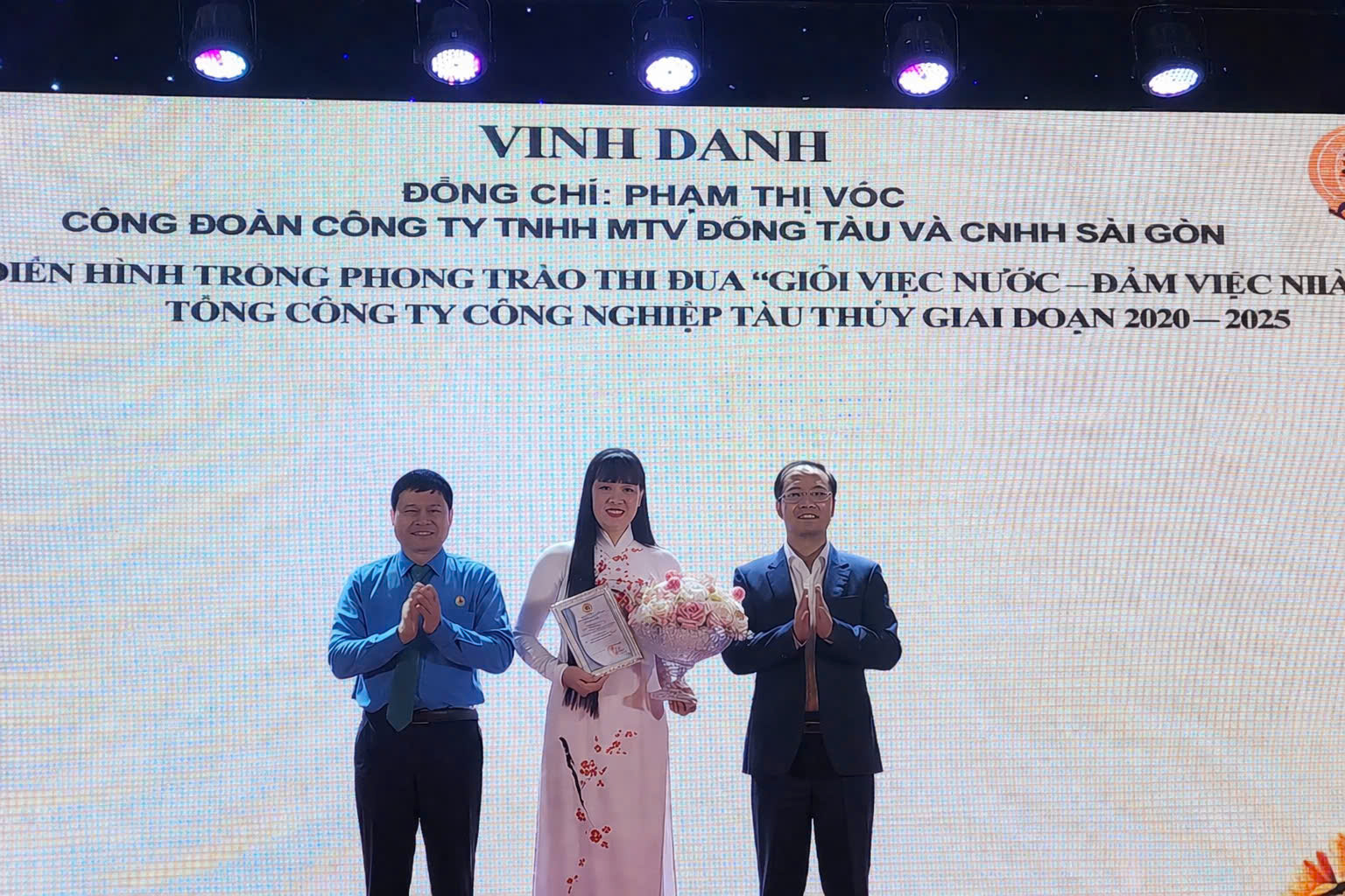 Đồng chí Trần Mạnh Hà - Tổng giám đốc Tổng Công ty chia vui cùng công đoàn Công ty đóng tàu và CNHH Sài Gòn và hai chị Phạm Thị Vóc và Mai Thị Hòa tại Hội nghị biểu dương " Giỏi việc nước đảm việc nhà" giai đoạn 2020 -2025