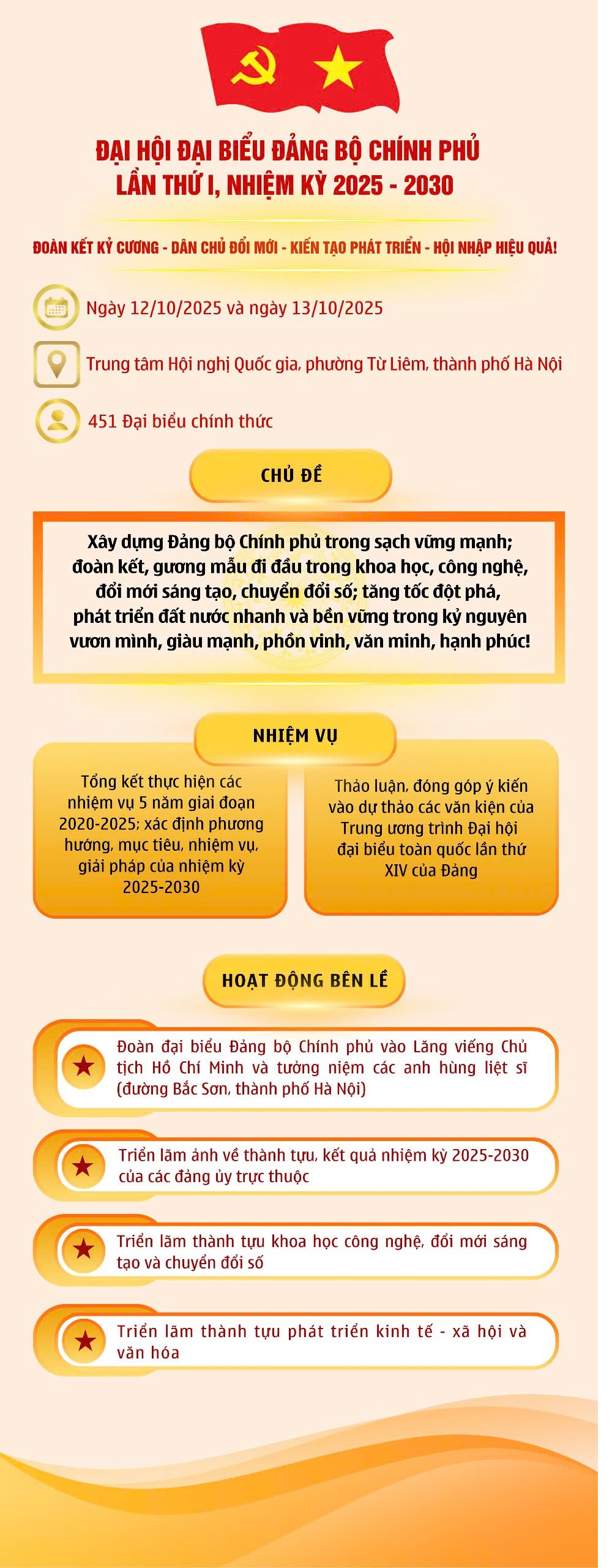 Trong 2 ngày 12,13/10, Đại hội đại biểu Đảng bộ Chính phủ lần thứ I, nhiệm kỳ 2025-2030 sẽ chính thức diễn ra tại Trung tâm Hội nghị Quốc gia (phường Từ Liêm, Hà Nội). Đại hội sẽ có sự góp mặt của 451 đại biểu chính thức.