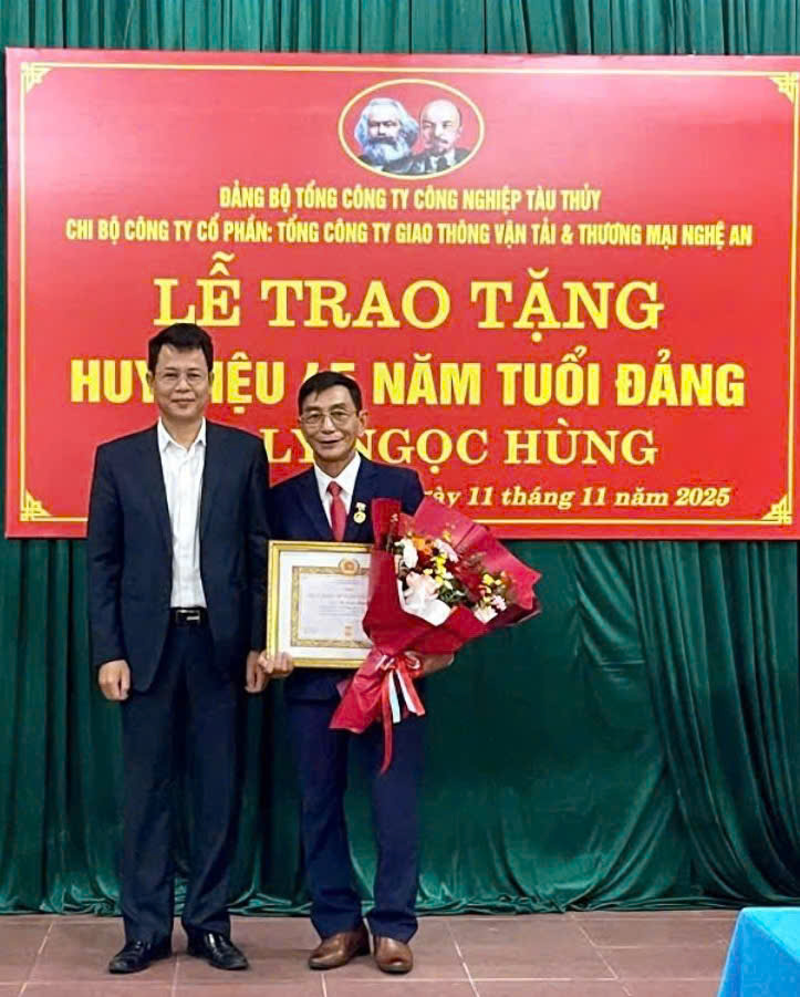 Triển khai Quyết định số 261-QĐ/ĐU, ngày 15/8/2025 của Đảng ủy Chính phủ về tặng Huy hiệu Đảng đợt 02/9/2025 cho đảng viên thuộc Đảng bộ Bộ Xây dựng. Ngày 11/11/2025, tại Nghệ An, Đảng ủy Tổng công ty Công nghiệp tàu thủy đã tổ chức lễ trao tặng Huy hiệu Đảng 45 năm cho đồng chí Lý Ngọc Hùng – Đảng viên Chi bộ Công ty Cổ phần Tổng công ty Giao thông vận tải và Thương Mại Nghệ An – Đảng bộ Tổng công ty Công nghiệp tàu thủy.