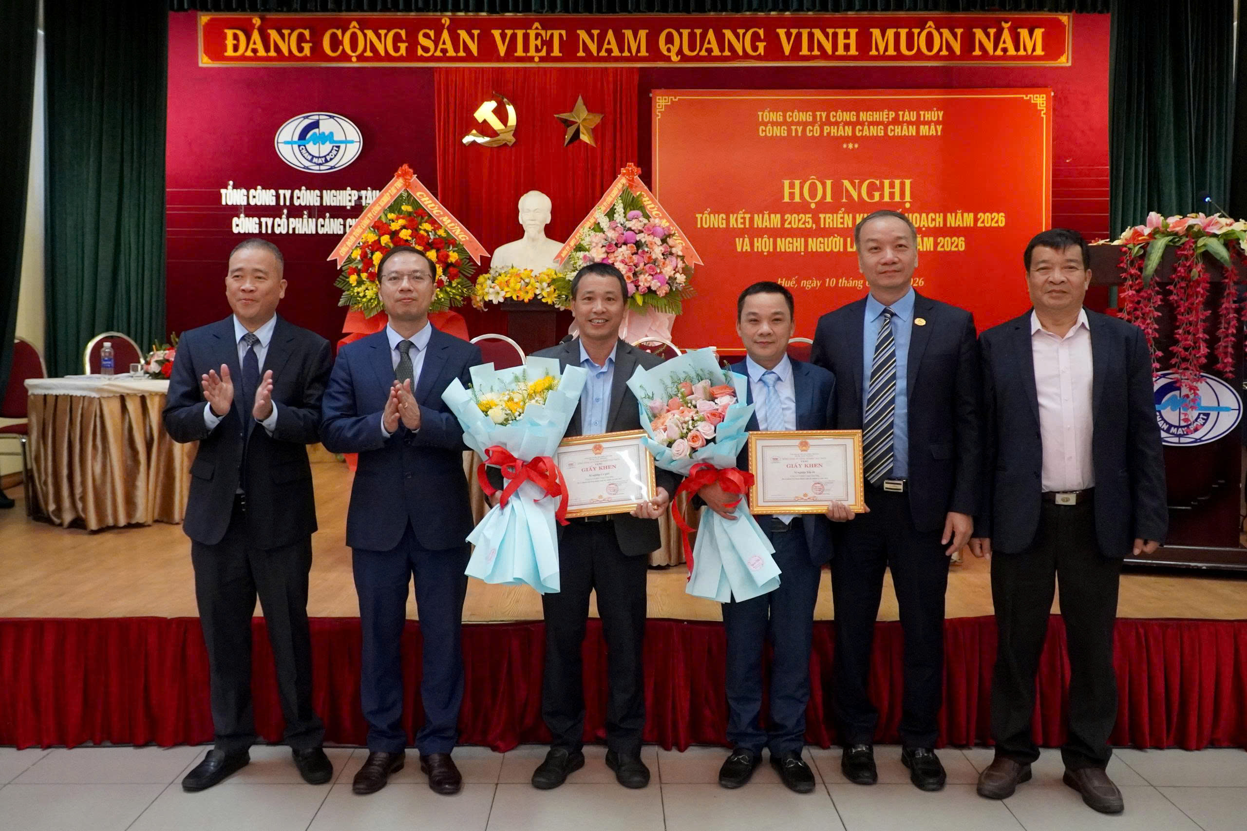 Các đồng chí: Đặng Minh Thịnh - Chủ tịch; Hoàng Văn Tùng - Tổng giám đốc Công ty CP đóng tàu Sông Cấm trao tặng giấy khen của Công ty cho Tập thể cá nhân có thành tích xuất sắc năm 2025