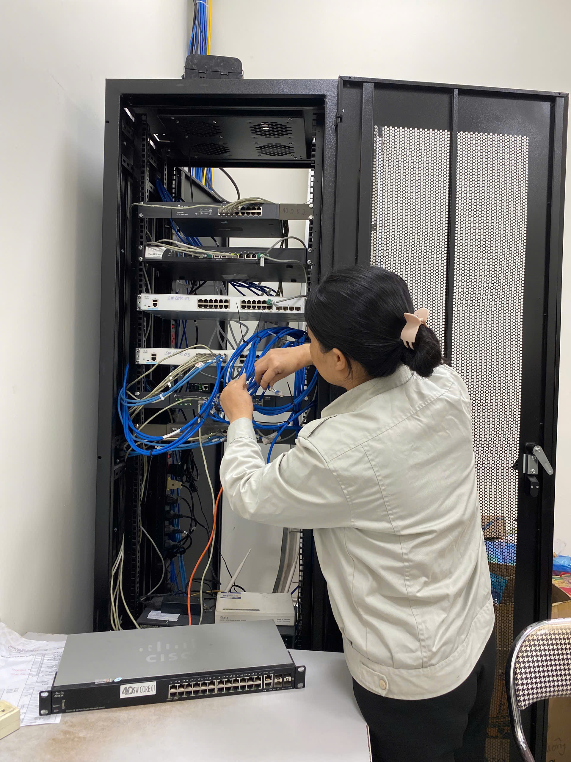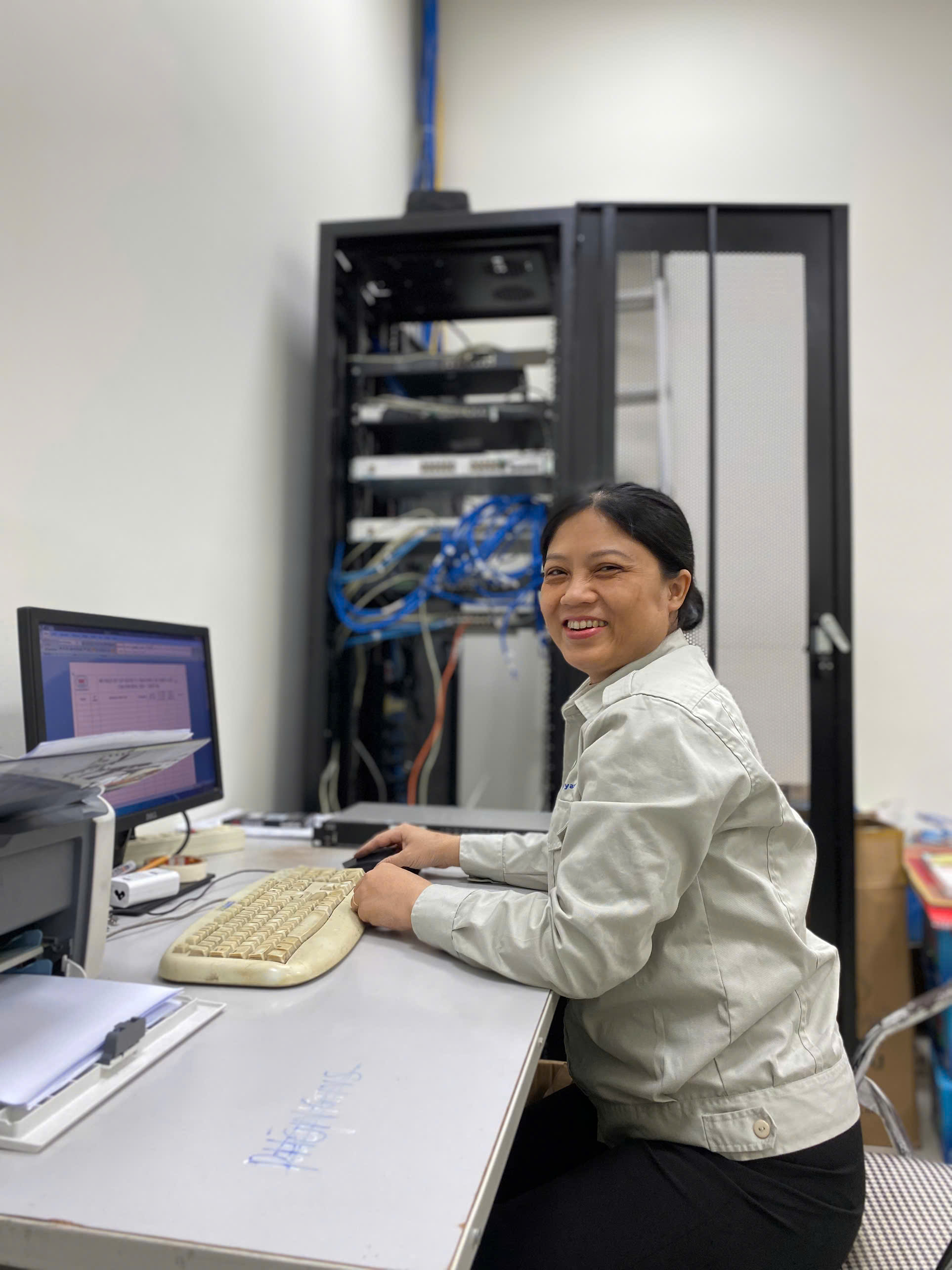 Chúng tôi gặp Lê Thị Hương – Chuyên viên công nghệ thông tin – người phụ nữ mà đồng nghiệp ở Phà Rừng hay gọi thân thương là người giữ “mạch máu số” của Công ty, trong không gian phòng kỹ thuật, Hương đang tập trung kiểm tra và đấu nối các đường cáp mạng trong hệ thống tủ server của công ty. Công việc của chị đòi hỏi sự tỉ mỉ, chính xác và kiến thức chuyên sâu về hạ tầng mạng, bởi mỗi đường dây, mỗi cổng kết nối đều là một phần quan trọng của hệ thống vận hành số. Hằng ngày, chị đảm nhiệm việc quản lý, lắp đặt và bảo trì hệ thống mạng nội bộ, bao gồm switch, router, thiết bị truyền dẫn và hệ thống máy chủ; sửa chữa máy tính… Những sợi cáp mạng được sắp xếp, đánh dấu và kết nối cẩn thận để đảm bảo dữ liệu và thông tin trong toàn bộ công ty luôn được truyền tải ổn định, thông suốt. Trong đơn vị, đây là vị trí mang tính đặc thù và gần như duy nhất, bởi toàn bộ hệ thống công nghệ thông tin – từ mạng nội bộ, phần mềm làm việc đến kết nối dữ liệu giữa các bộ phận – đều phụ thuộc vào sự vận hành ổn định của hạ tầng mà Hương phụ trách. Âm thầm phía sau những dãy thiết bị kỹ thuật, nữ chuyên viên công nghệ thông tin chính là người giữ “mạch máu số” của doanh nghiệp, đảm bảo mọi hoạt động sản xuất, quản lý và trao đổi thông tin diễn ra liên tục, an toàn và hiệu quả.