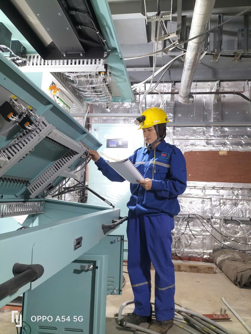 Nữ công nhân lắp ráp hệ thống điện ở tàu đóng mới phòng Quản lý thiết bị cơ điện