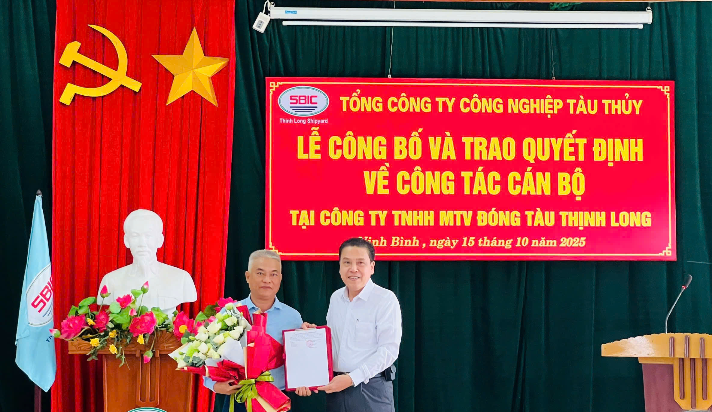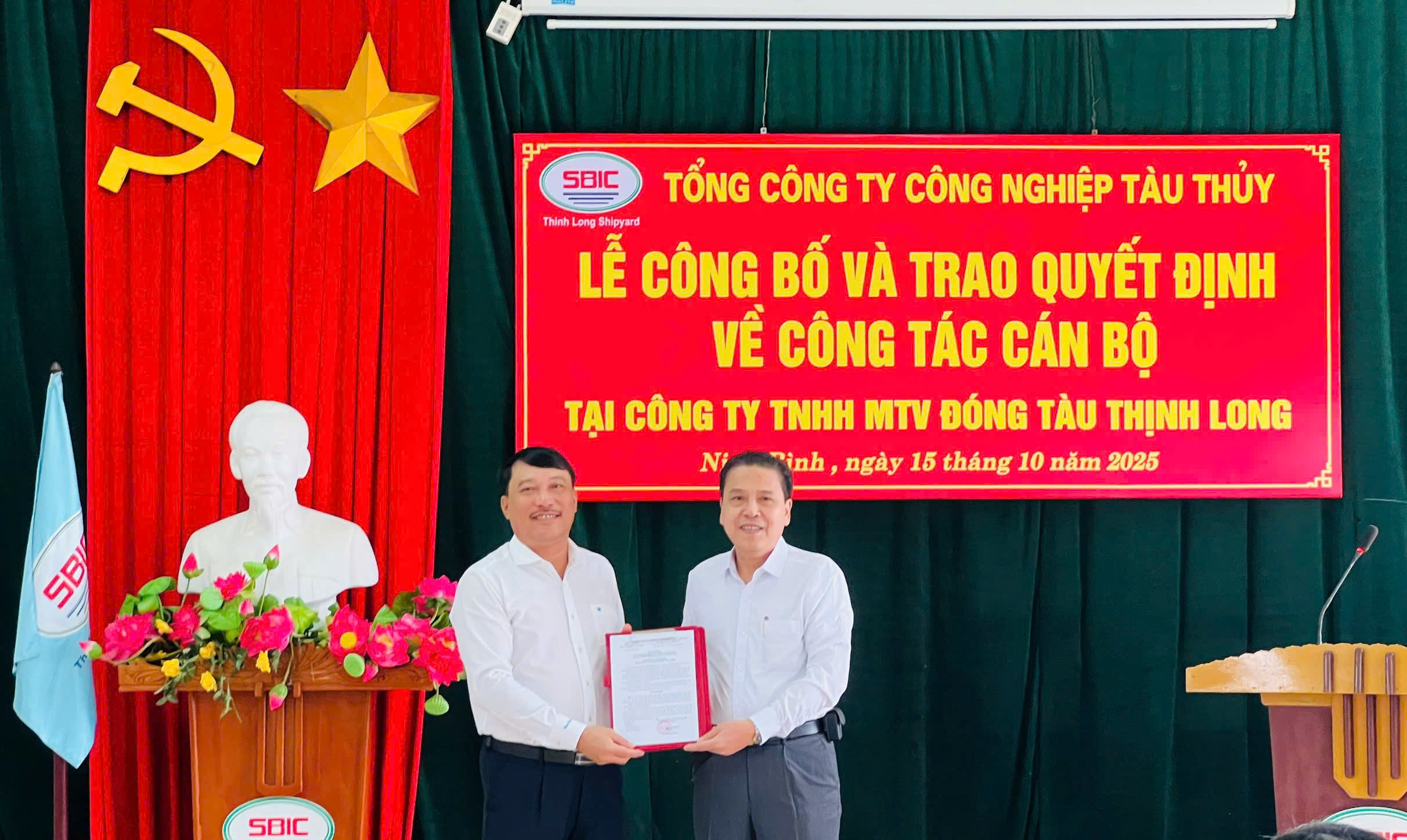 Ngày 15/10/2025, tại Công ty TNHH MTV Đóng tàu Thịnh Long, Tổng công ty Công nghiệp tàu thủy (SBIC) đã tổ chức Lễ công bố và trao quyết định các quyết định: Bổ nhiệm lại ông Nguyễn Khánh Tường giữ chức Chủ tịch Công ty TNHH MTV Đóng tàu Thịnh Long (Quyết định số 224/QĐ-CNT ngày 21/08/2025); Bổ nhiệm lại ông Trương Thành Hùng giữ chức Tổng giám đốc Công ty TNHH MTV Đóng tàu Thịnh Long (Quyết định số 225/QĐ-CNT ngày 21/08/2025).