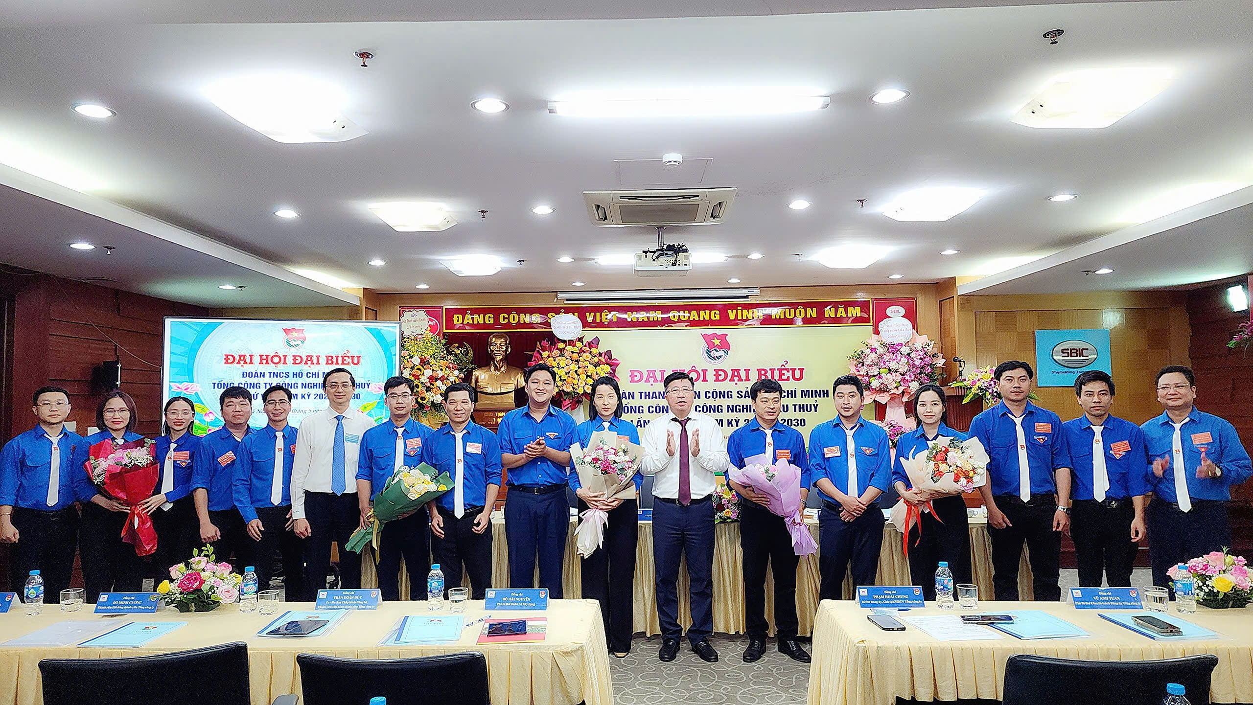 Đồng chí Phạm Hoài Chung - Bí thư Đảng ủy, Chủ tịch Hội đồng thành viên tặng hoa Ban chấp hành Đoàn thanh niên Tổng Công ty (Ngô Thu Hoa trúng cử BCH ĐTN TCty nhiệm kỳ 2025 -2030)