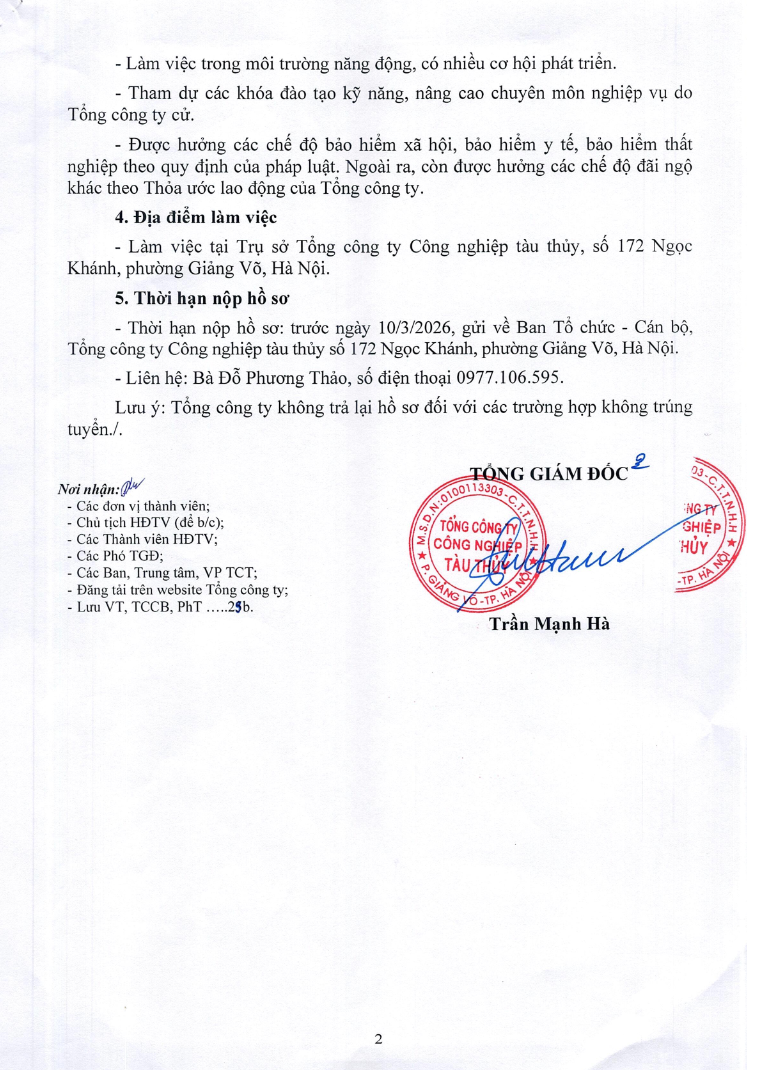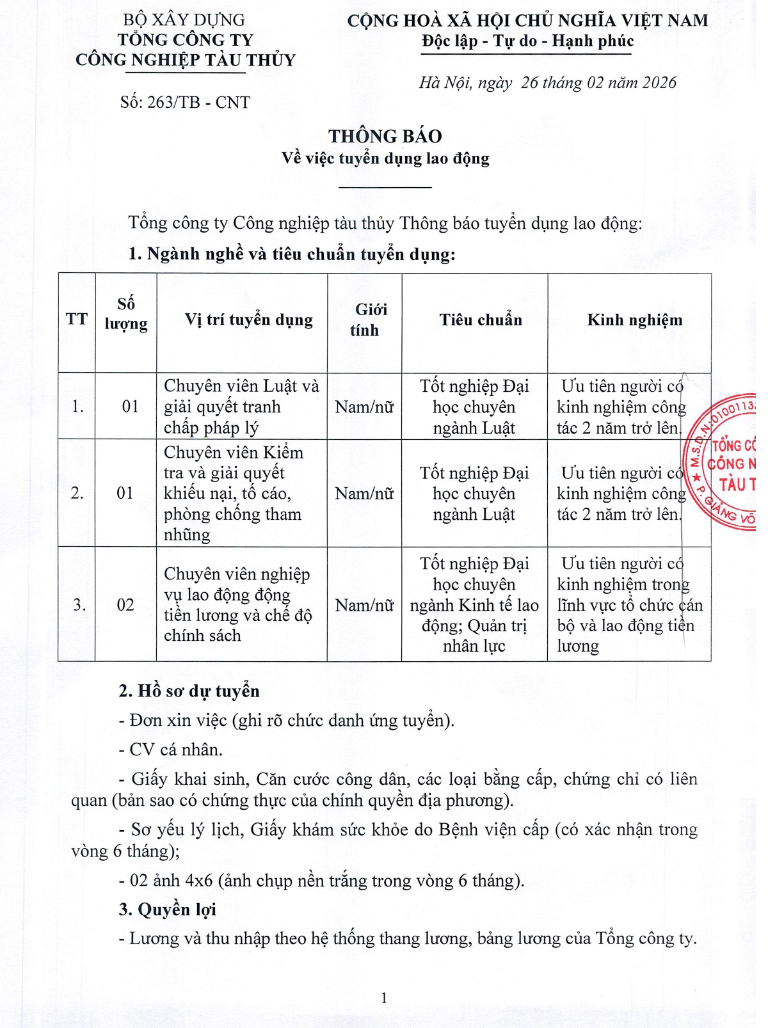 Thông báo: Căn cứ vào kế hoạch lao động năm 2024, Tổng công ty Công nghiệp tàu thủy Thông báo tuyển dụng lao động như sau: