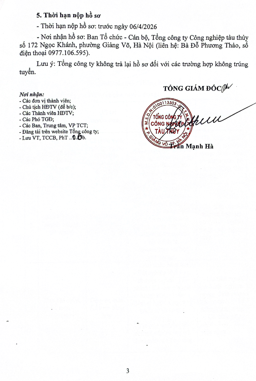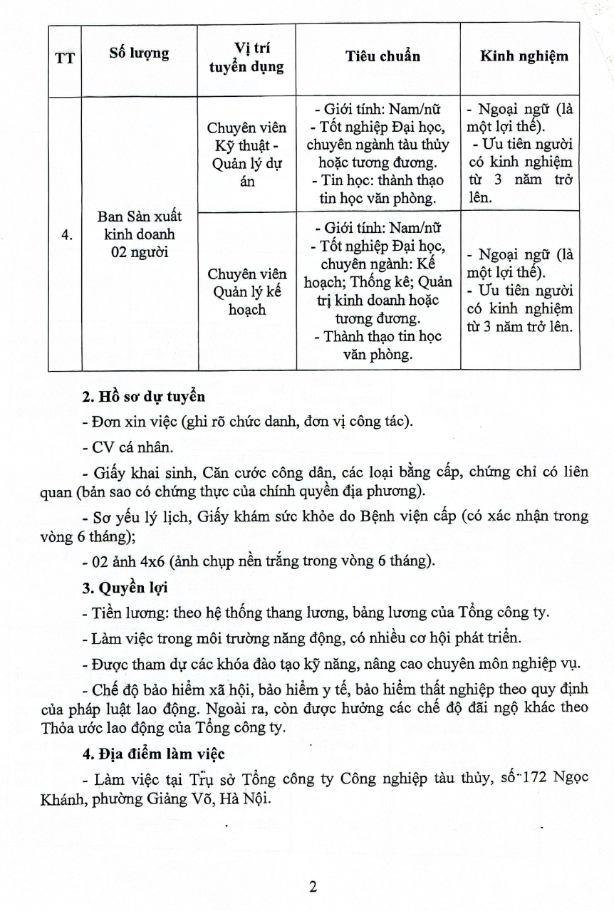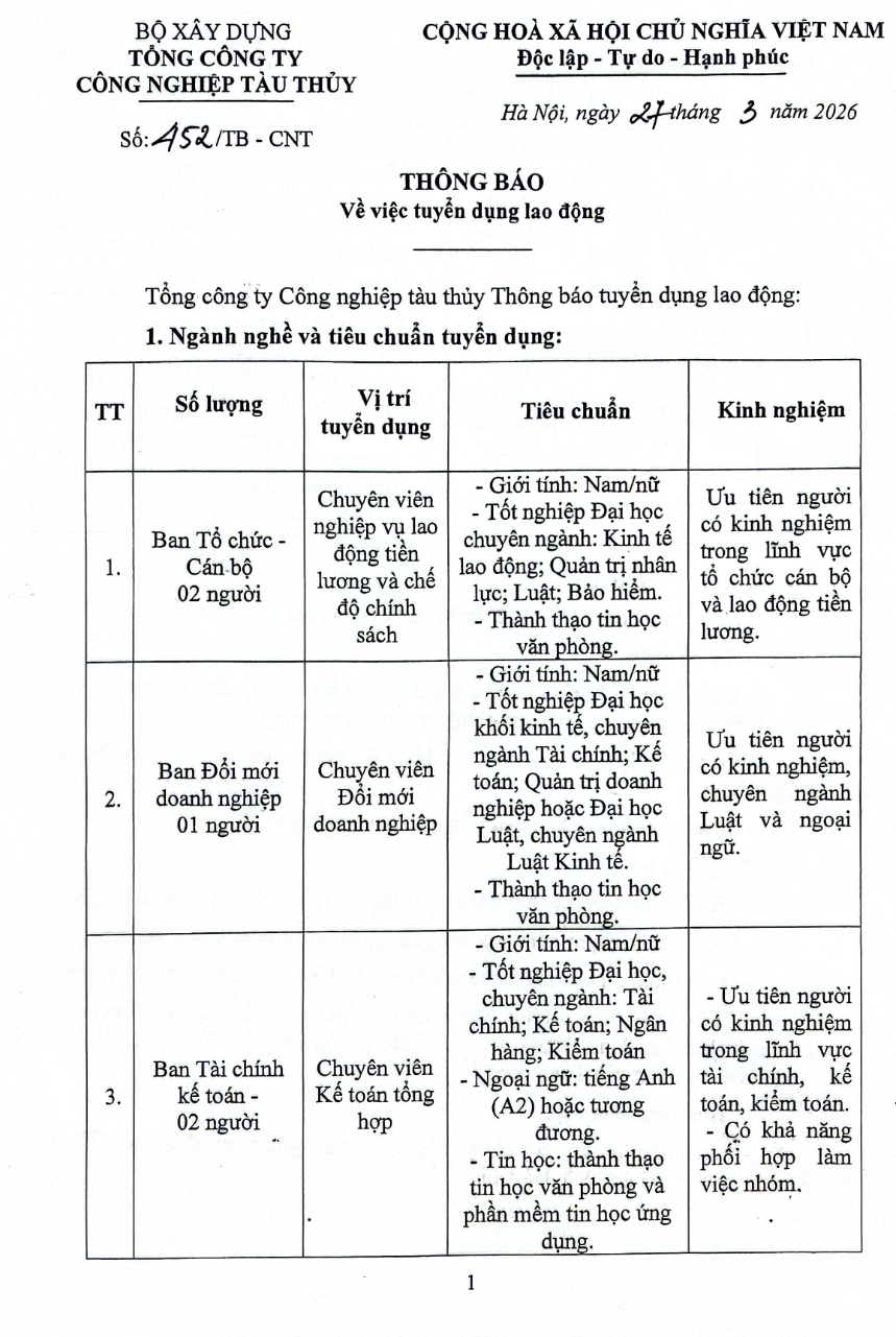 Thông báo: Căn cứ vào kế hoạch lao động năm 2024, Tổng công ty Công nghiệp tàu thủy Thông báo tuyển dụng lao động như sau: